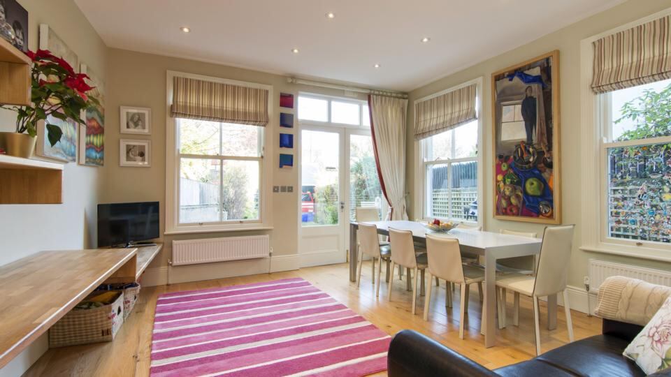 Off the hall with its black and white chequerboard tiled floor there are two interconnecting reception rooms with polished timber floors, sash windows and feature period fireplaces. The contemporary-style kitchen is in the rear return and has glossy cream units on facing walls, cream stone worktops and a fireplace. It leads directly into the extension – a bright family room which is also the dining room. It has a fireplace and is floored with wide-plank oak. Glazed doors open out on to the deck.