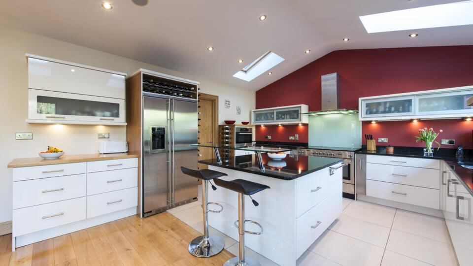 A formal reception room has a smooth travertine wall with integrated dancing flame gas fire and leads to a circular sunroom. Used as a breakfast room, the sunroom has tilt-and-turn windows, allowing each to be used as doors should a glorious summer arrive. The room is also lit from above by a dome ceiling window. The dining room, with a raised gas fire, houses an enormous table and is evident of the Rhodes's love of entertaining. A smaller room lined with bookshelves is used as a study.