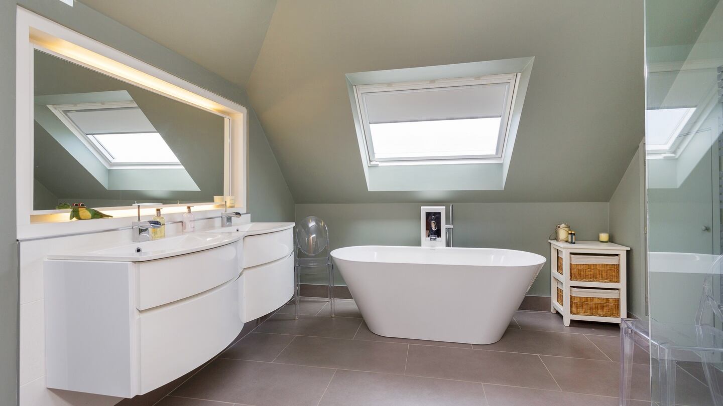 The bedroom is painted a shade of taupe and has a cream-coloured carpet and a wall of wardrobes. Across the landing, the family bathroom has a free-standing oval bath, a walk-in double shower and double-sink unit with a large lighted mirror and drawers underneath.