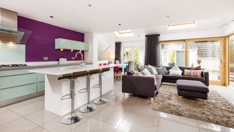 Kevin’s building company, KS Construction, did the work and the result is a large, bright living space to the rear. It has velux windows and French windows, stone coloured ceramic tiling, a wood- burning stove, dining alcove reaching into the garden and bespoke working kitchen to warm the heart of any cook. “I like to cook,” Michelle says, “And knew what I wanted.”