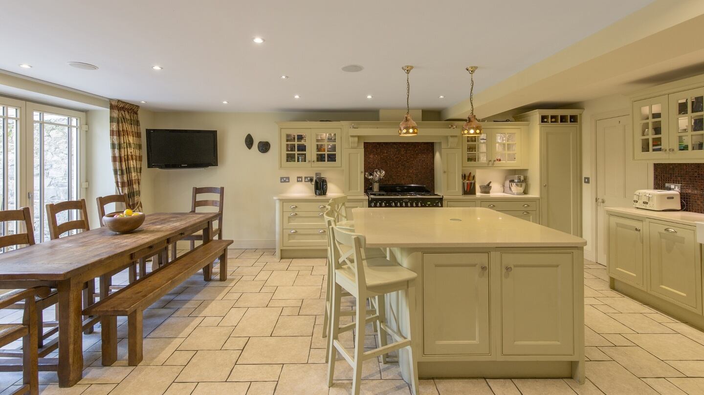 At garden level, and now accessed by a fine staircase, with an exposed brick wall adding detail, is the family kitchen. “It was worth the wait,” says Nicholl of the six months of uncertainty regarding permission to create the hub of the house – a 44sq m (474sq ft) kitchen, designed by FitzGerald Kitchens in Tinahealy, which opens out onto a patio through concertina doors. The property has four bedrooms, three of which are en suite, the fourth, currently used as a playroom, is plumbed for a bathroom.