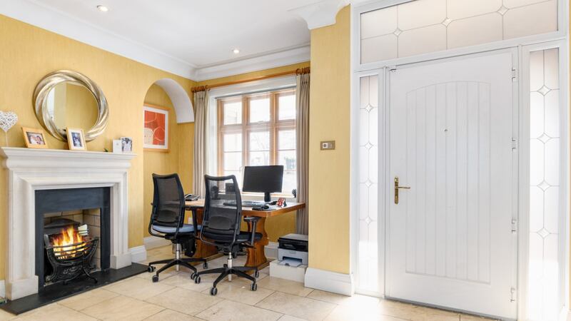 The layout is quite different from the original. What would have been a small study to the front was knocked through to make a large, open reception hall with a fireplace, and this leads into the converted garage. The door out from here to the side passageway could be a boon to buyers who decide to use it as a home office.