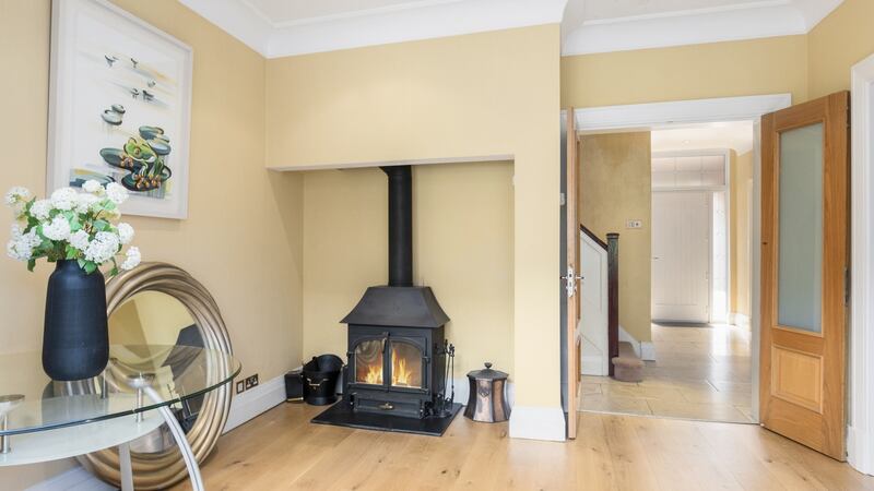 The reception rooms on the other side of the hall, which would have interconnected, are now separate, something new owners might wish to change. There is another seating area on the way into the kitchen that’s fitted with a wood-burning stove.