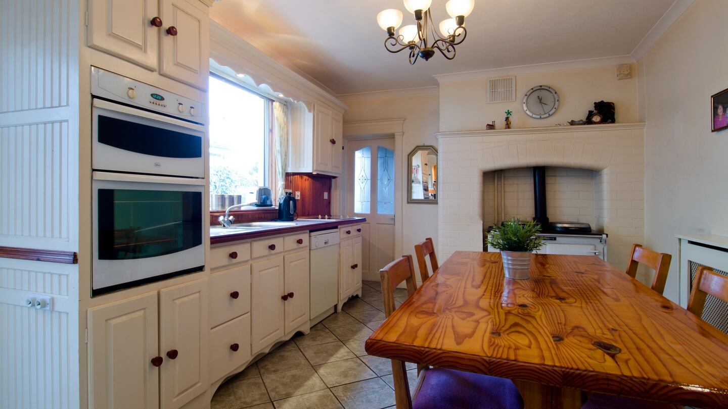 The kitchen on the return has a four-door Aga set into the original chimney. Its layout hasn’t changed in decades and there is scope to extend and reconfigure this room so that it opens out to the extensive garden.