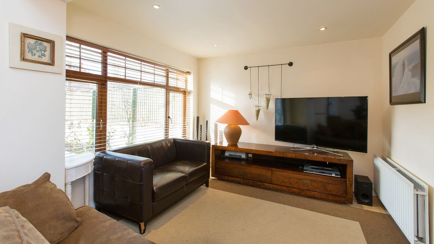 French doors open from this extension into a long – and wide – back garden. The large deck, with loads of room for dining, looks over the lawned back garden.