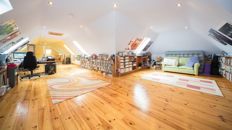 A cherrywood staircase leads from the front hall up to the dormer level of the house. It is a space that stretches the width of the house, with the owner’s huge open-plan office at one end and a recreation area at the other. The space could be reconfigured to create more bedrooms.