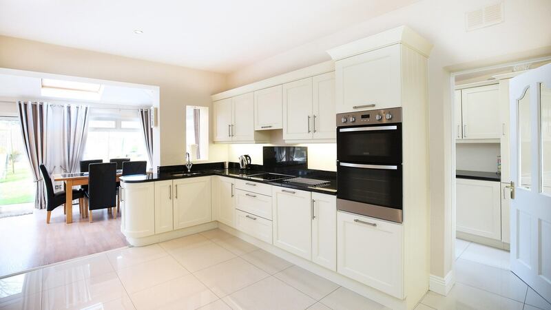 The heart of the house is towards the back, where the kitchen opens into the breakfastroom/family room area, looking on to the back garden through large picture windows. The Nolan kitchen has granite countertops, a tiled floor and opens into a good-sized utility room, with access from it to the front and back gardens.