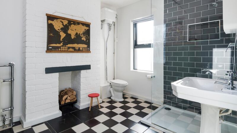 The main bathroom is huge, has a Victorian-style toilet, a large shower stall and a checkerboard floor. The door architraves are painted in Farrow & Ball Downpipe, a liquorice shade.