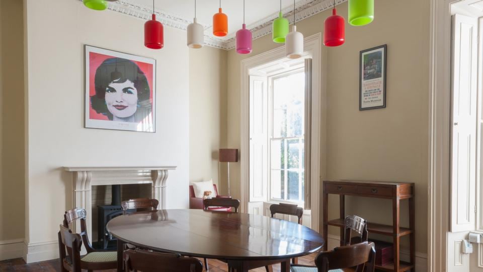 A quirky colourful light fitting from Avoca in one of the elegant first floor reception rooms survived the handover, but aside from this no clear design stamp has been applied since. Throughout Tubridy's love of books and all things 1960s are in evidence from the Jackie O picture over the fireplace and a framed image of Dean Martin and the Beatles Abbey Road album cover.
