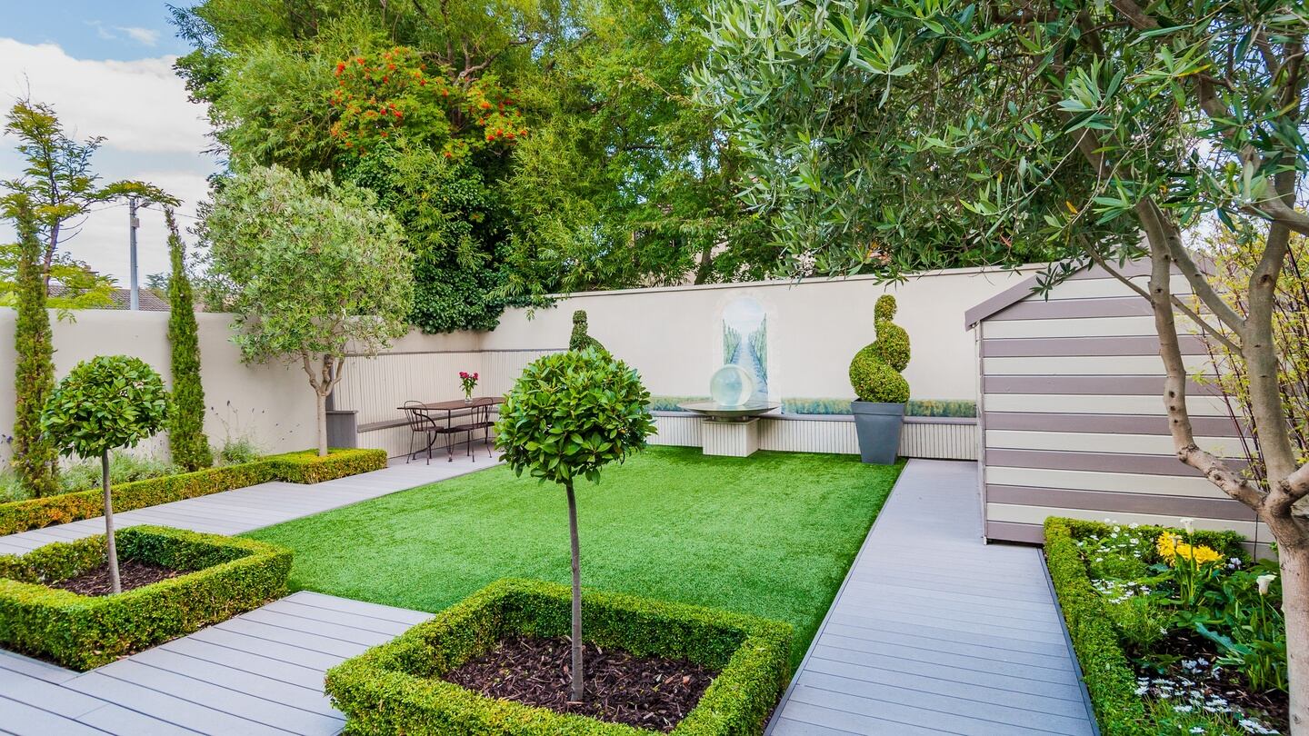 “The kids can play happily there with friends, and there’s no mud and no fuss,” says one of the owners. There’s also a sitting area, and a trompe l’oeil mural at the end, so you can squint and imagine you’re in the formal gardens of some incredibly grand mansion, albeit scaled down.