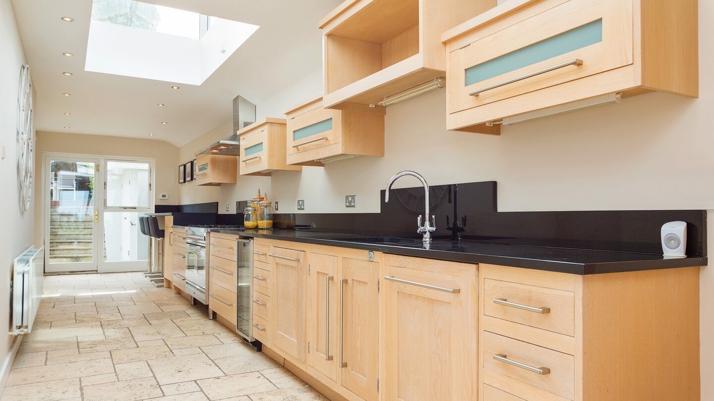 The long kitchen, with the breakfastroom to the front and stone-tiled floor, has extensive fittings, black granite worktops and a black-topped breakfast bar. A couple of lantern-style vaulted skylights are operated electrically. The other three bedrooms are on this level, the main one front facing with a walk-through dressing and en suite. Both other bedrooms are to the rear, have timber flooring and glass doors to the garden.