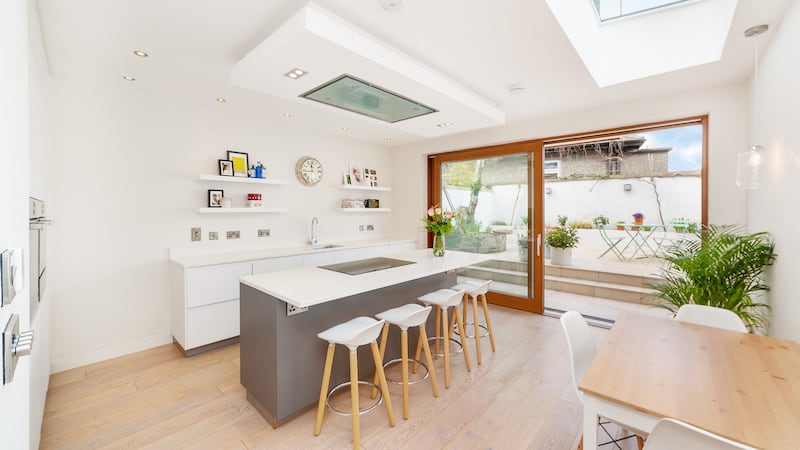 The house, which has a small front garden, opens into a tiled hall retained to a style redolent of its Victorian heritage. The living room and dining rooms have been opened up to create one large space with the sofas set around a fireplace and a large sash window to the front, supplied by Westport-based O’Malley Joinery.