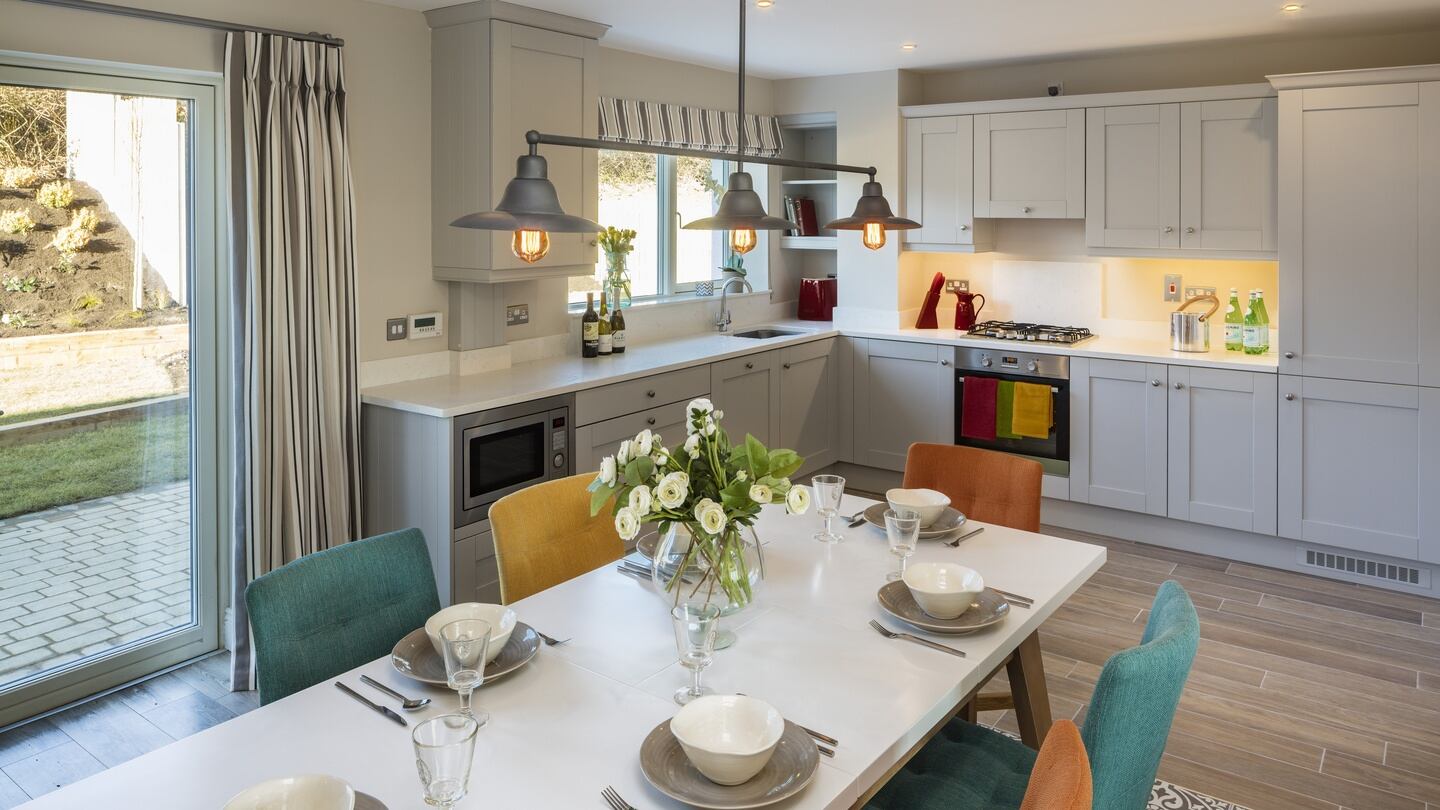 The good-sized livingroom on the left of the hall in the five-bedroom showhouse has tall windows; the wide kitchen breakfastroom at the back has polished quartz countertops, a utility room-cum-larder off it and integrated kitchen appliances.