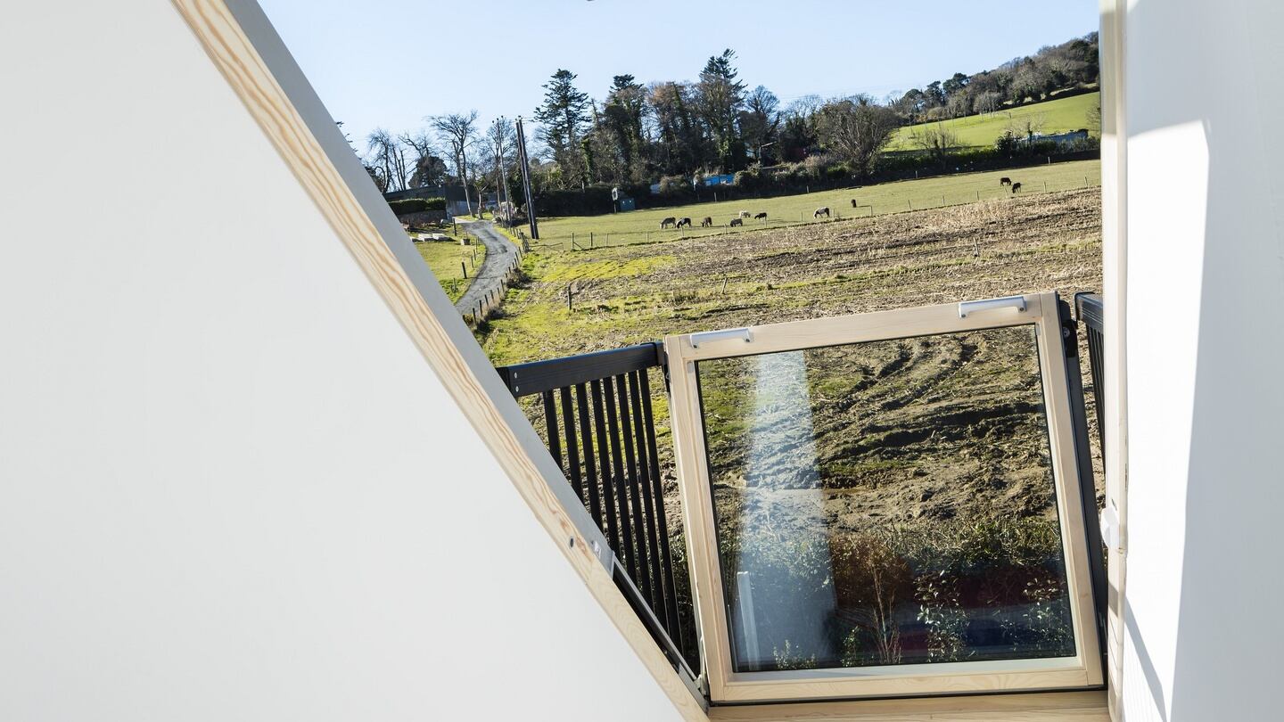 The fifth bedroom at the very top of the house is a surprise: it has an unusual Velux Cabrio window that converts into a small balcony looking up at Coolagad Hill. Interior designer Eily Roe has designed the bedroom as a child/teenager’s room, with funky wallpaper that makes one of the walls look like a graffitied concrete wall.