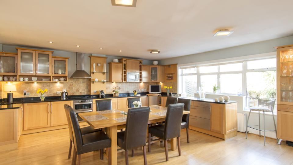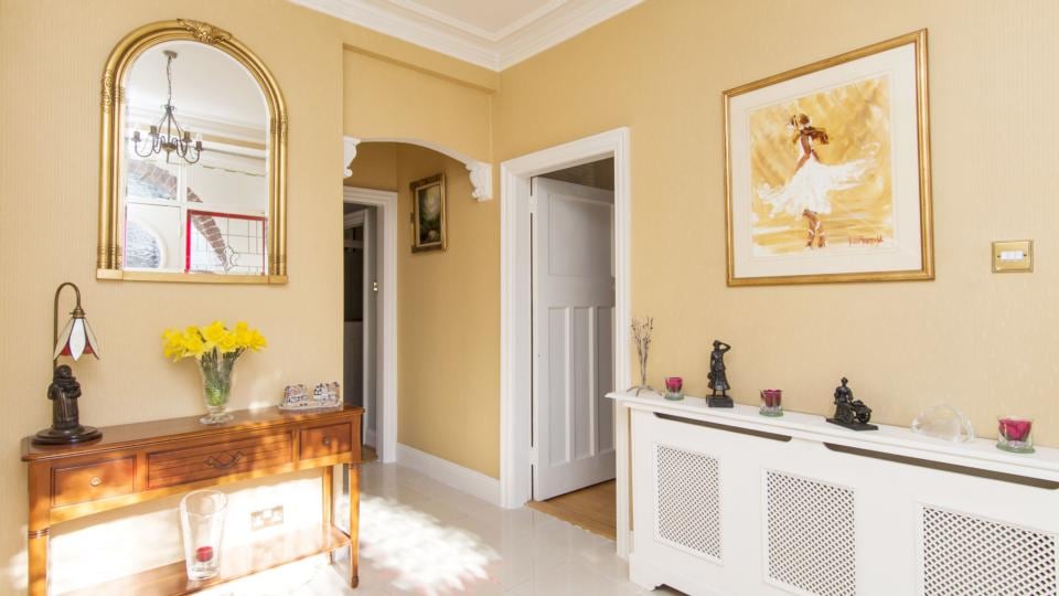 Downstairs, there’s a roomy hallway with the original front-to-back sitting room flowing into drawingroom to the right; with the family room and kitchen to the left. There is a utility room that has an extra cooker, making it an ideal catering space for parties.