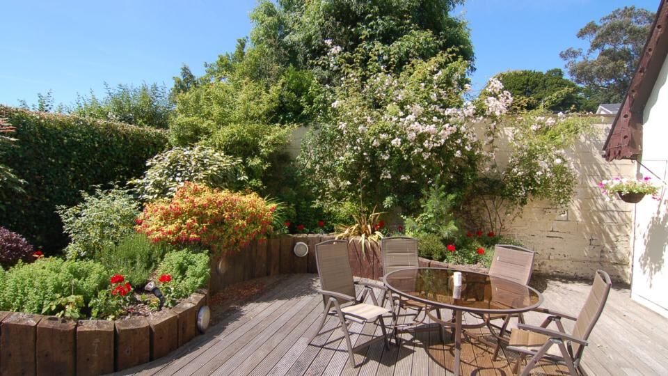 The split-level garden has a botanical spread of plants and trees, pebbled walks, lawns, granite steps and a walled area landscaped in granite where prunus trees form a semicircle.