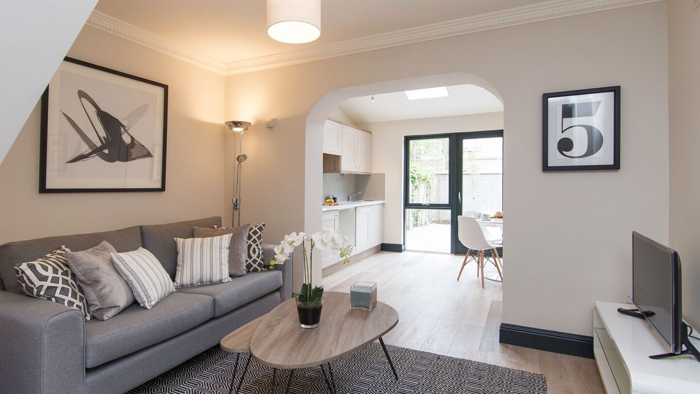 The front door opens directly into the open-plan living cum kitchen which runs the depth of the house and is floored in a limed oak. The living room area to the front has an open fire. While the property has been staged for sale by House & Garden, the next owner will want to give some thought as to how best to configure furniture here to make it feel homely and not like a large hall.