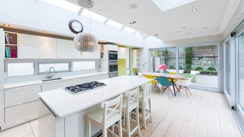 On the left there’s a downstairs study, understairs toilet and a good-sized utility room. Two cleverly concealed sliding doors pull across to close off the kitchen/dining room in the extended rear of the house.