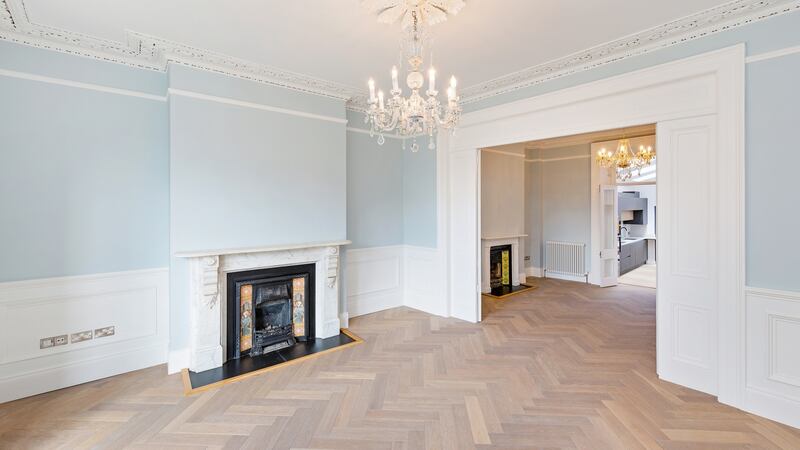 The property’s many original features, most notably the elaborate ceiling plasterwork and marble fireplace in the front reception room, have been retained while new herringbone parquet updates this and the adjoining reception room to the rear.
