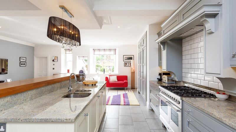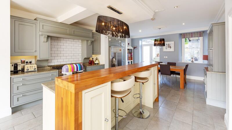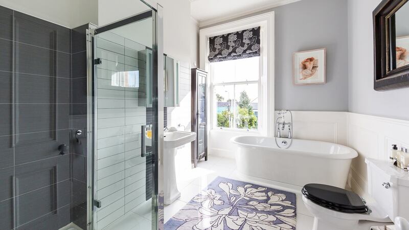 Upstairs are two bedrooms and a smart family bathroom on the first floor and three more bedrooms on the top floor with another family bathroom – the owners aren’t fans of en suites. The large main bedroom, painted a pale peacock blue, looks over the rooftops of Monkstown’s De Vesci Terrace towards Dublin Bay. The three bedrooms upstairs are all smaller doubles and all, like the two bedrooms below, have fitted wardrobes.