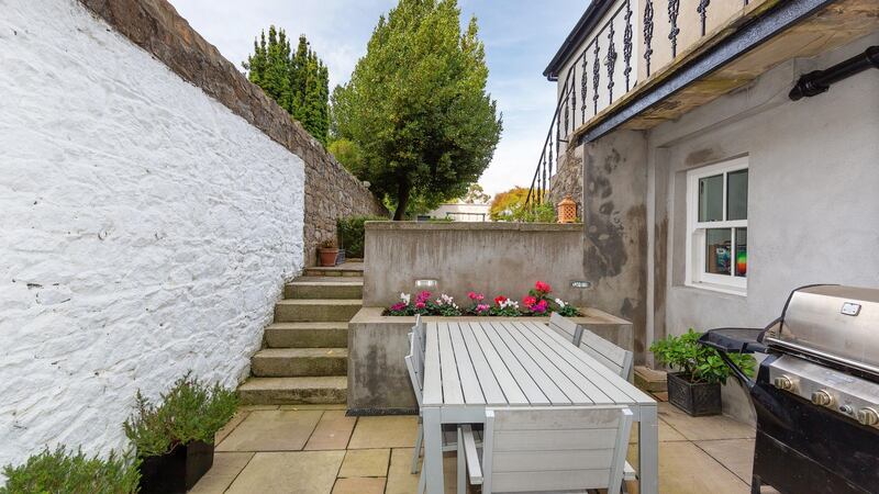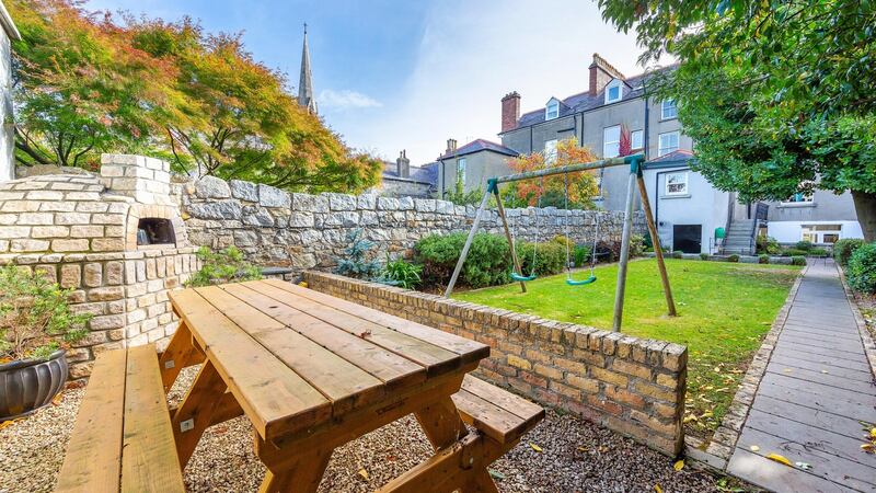 The back lawn, bordered by granite walls, has another patio area at the end with a brick pizza oven built by one of the owners. A large three-car garage at the bottom of the garden opens on to Knapton Lane, accessed from Knapton Road in Monkstown.