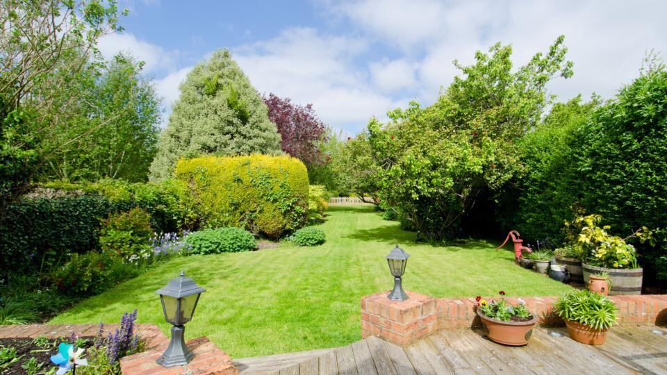 The open plan to the rear of the house benefits hugely from what is an exceptionally long (190ft), lush and inviting garden. It stretches in three stages, from a decking area giving on to a cultivated lawn, shrubbery and flowers, to an orchard with apple, pear, plum and damson trees, and on, at the very end, to a second lawn/play area for children.