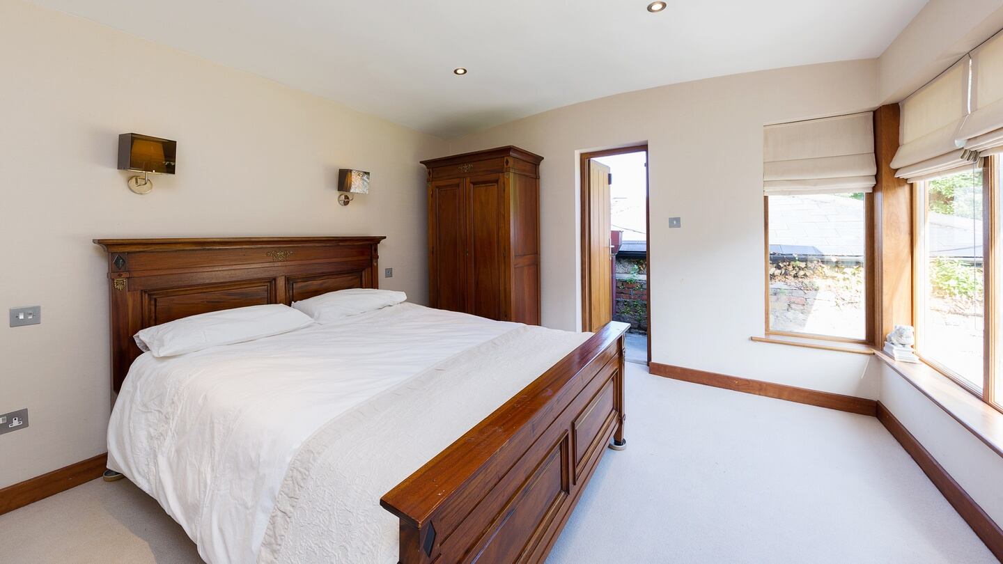 Back in the livingroom, another short flight of steps lead up to a shower room and the main bedroom, with its wall of windows and separate access to the garden and a lovely outlook over the back garden. There are two further bedrooms, one of which is currently used as a study.