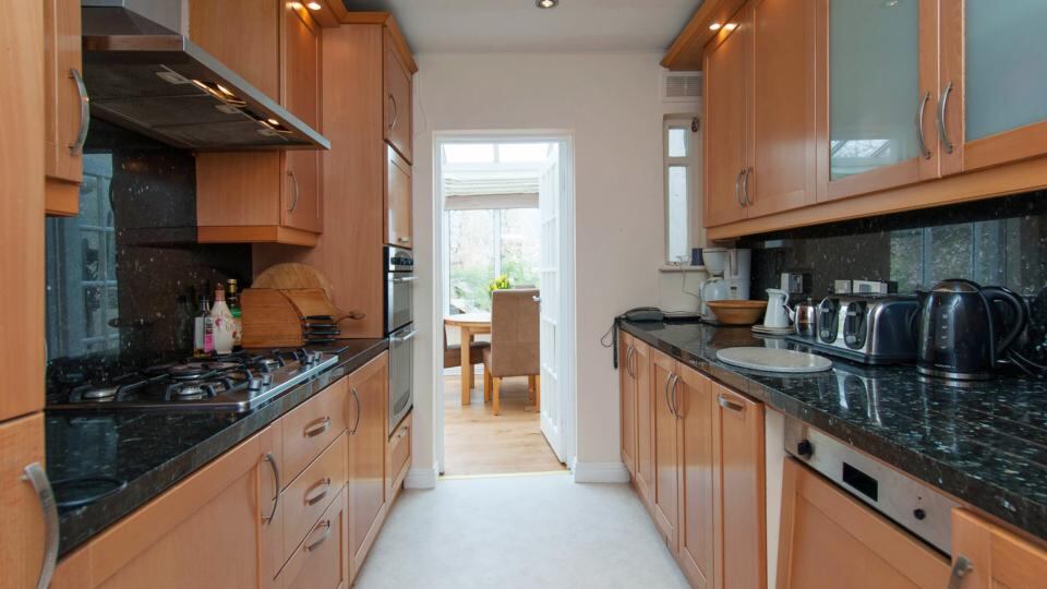 At the moment, there is a livingroom /diningroom to the left of the hallway, which lead through to the sunroom, and round to a nicely-done galley kitchen with granite worktops and splashbacks.