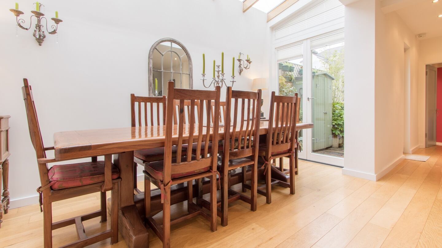 The rear is more contemporary. The kitchen/diningroom has a long, Lantern-style window in the ceiling, French doors to the patio and, in the German designed Eske kitchen, fittings with innovative touches.