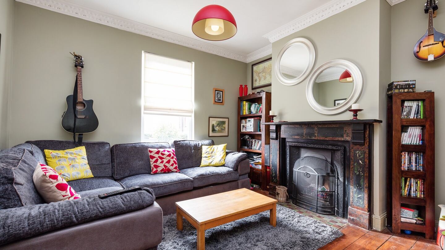 A front livingroom, painted a dark khaki, has an original, marble-surround fireplace and dramatically dark polished floorboards.