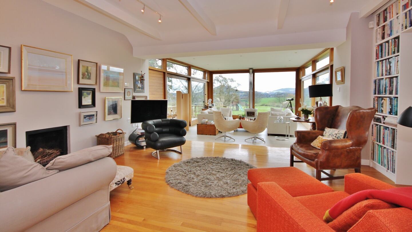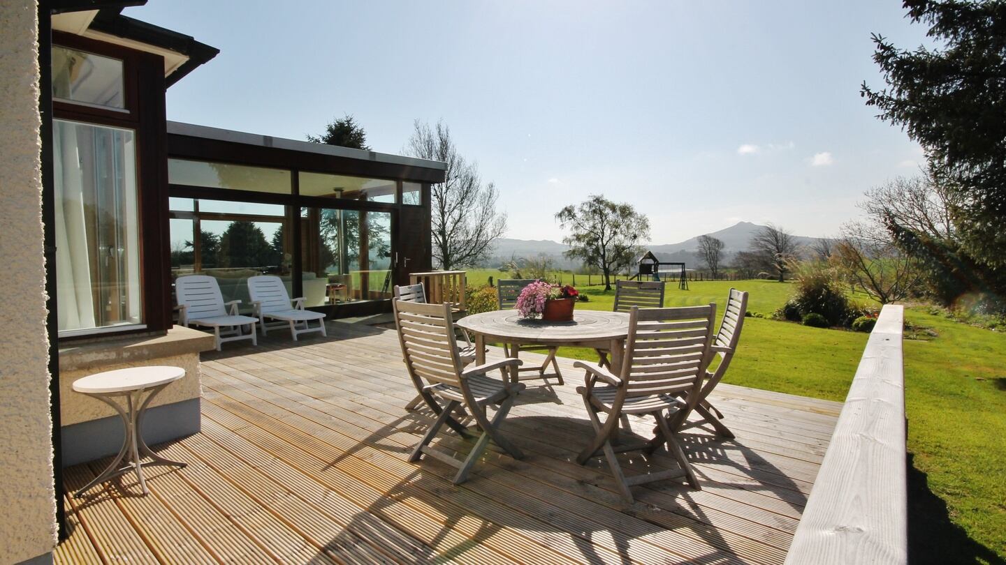 The attraction of a house with a modest exterior in the countryside near Bray and Enniskerry is apparent when you open the front door: you can see straight through from the front hall to views of the little and big Sugarloaf from the conservatory- style livingroom at the back of the house.
