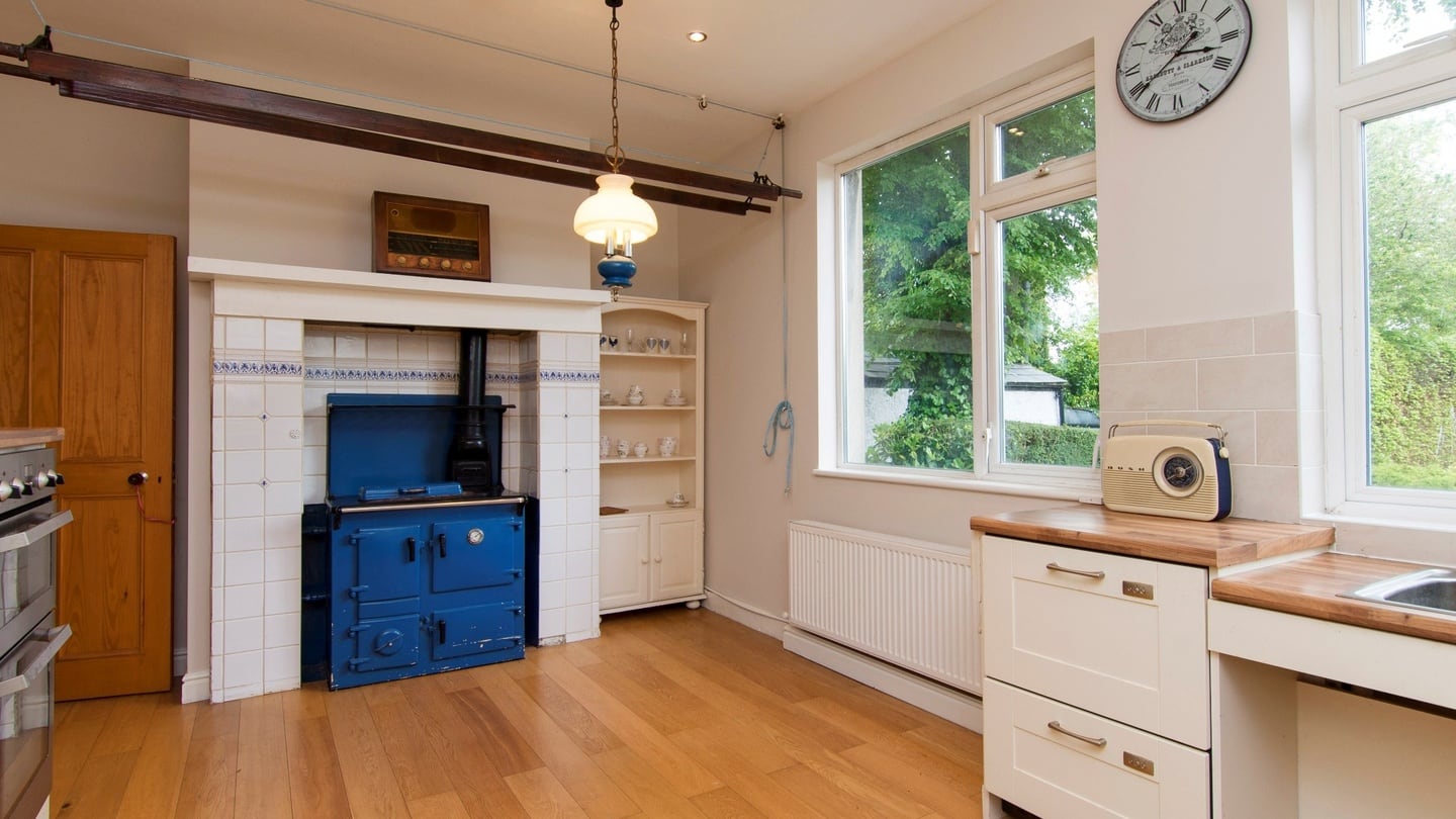 About 15 years ago, when they put in new windows to the front, the owners installed a conservatory to the rear, accessed from the diningroom via a pair of doors. The new owners might like to update this or indeed incorporate this space into the eat-in kitchen where there is a Rayburn range in a lovely shade of Yves Klein blue.