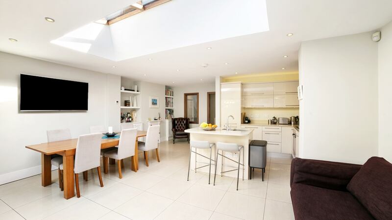 A set of steps lead to a large, open-plan kitchen, living room and dining room, much of which is an extension that its owners added in 2012, when they purchased it for €210,000, according to the Property Price Register. It’s accessed via a reading nook, where one of the wingback chairs from the chesterfield suite has found a home beside the built-in bookcases, and the tiled floor reflects light back into the space.