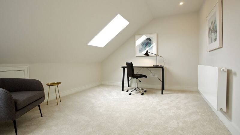 On the second floor there is another bedroom with an en-suite that could also work as the main bedroom. Across the landing from here is a bonus space – set up as a study and lit by roof lights, it could also work as a nursery.