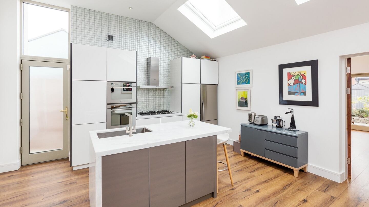 The rear of the property opens into a sizeable, bespoke kitchen of gloss white units with a grey trim. A reflective glass silver tile with silver grouting, from TileStyle, is a feature of the splashback and it reflects back much of the sunlight that streams into this room. This area is very much the heart of the house and extends to about 28sq m (about 301sq ft).
