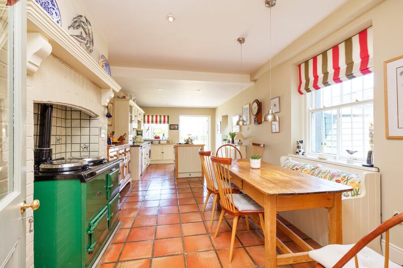 A long, cream painted kitchen/breakfast room stretches into the even longer rear garden. The floor is tiled in polished Spanish terracotta. The bespoke fittings have a rustic style, and a gas-fired Aga fits into an original, tiled chimney breast with mantel.