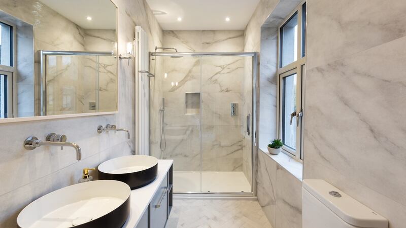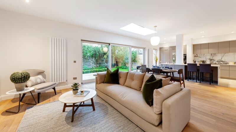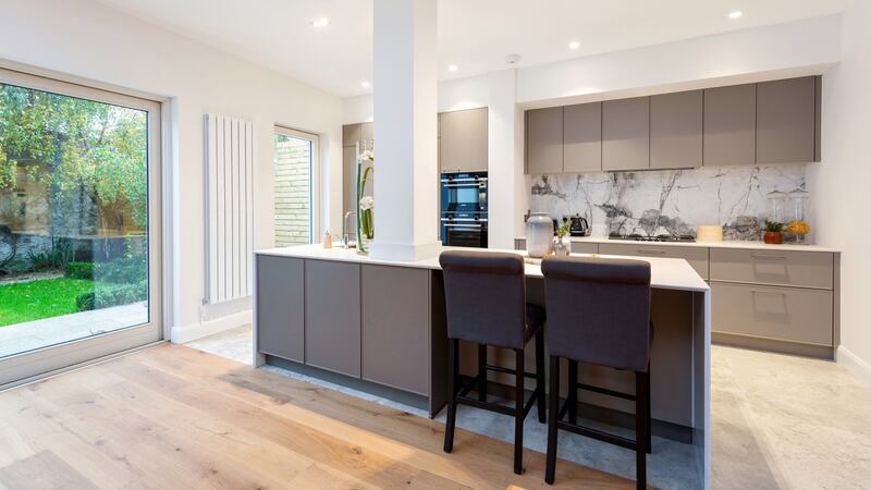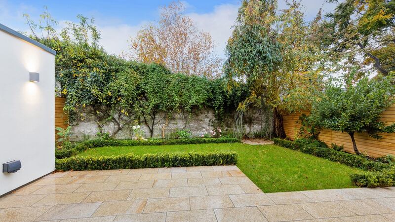 The kitchen area has 1sq m marble-look porcelain tiles from Versatile in Navan. There is a truffle oak coloured semi-solid timber floor through the rest of the room which opens out to an east-facing garden that, while not huge, feels really mature thanks to the retention of a creeper that climbs the boundary walls and mature trees.