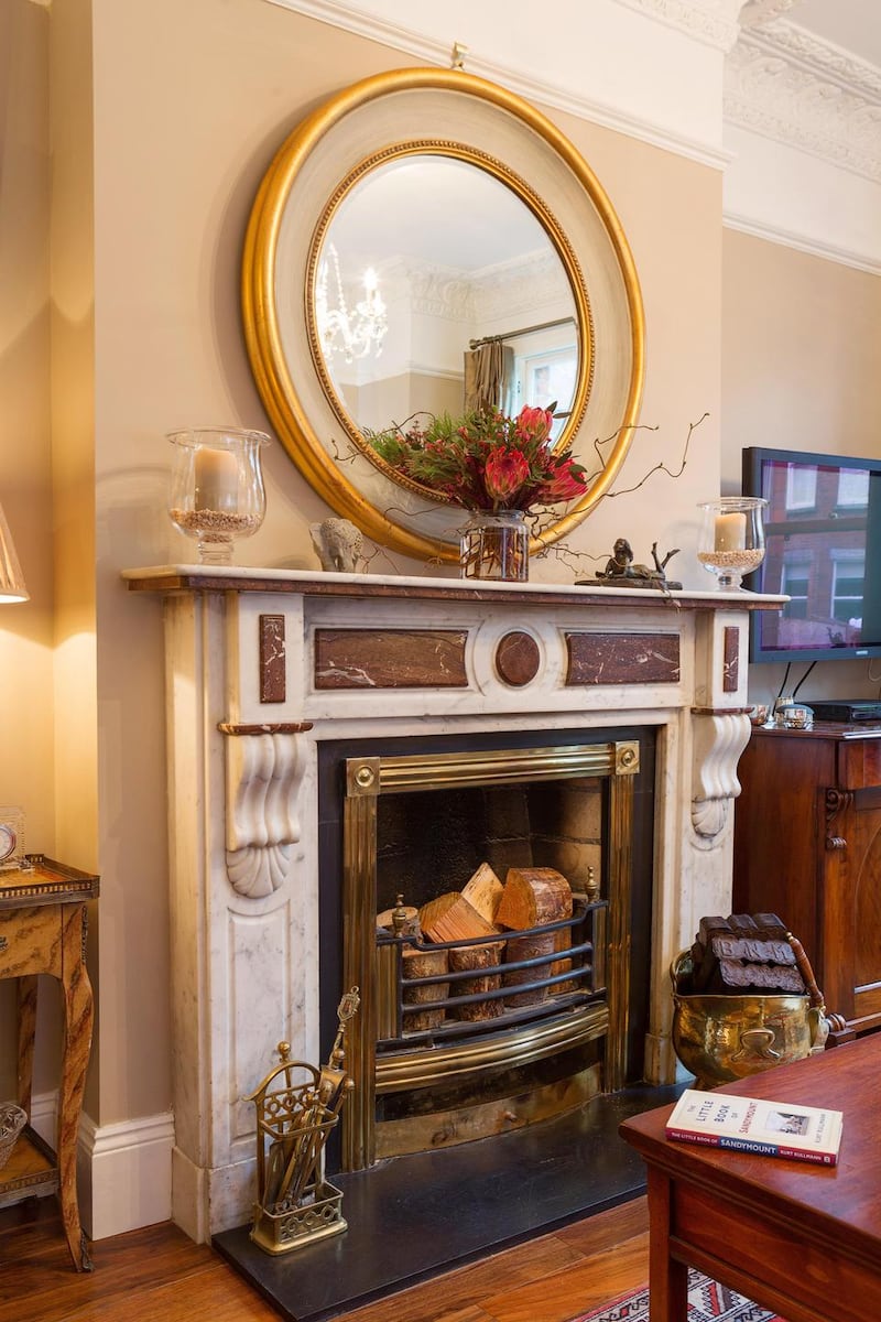 It’s a tall house – the vendor says they “got used to vertical living” – with ground and first floors, first and second floor returns and a top floor. The formal reception rooms make an eloquent style statement about the house’s Edwardian beginnings. Plasterwork and ceiling roses, original windows and an imposing marble fireplace contrast with the dark shine of an American walnut floor. Dado and picture rails in the hall also showcase Edwardian origins. The corbels are a convincing new addition, as is the leaded-glass front door.