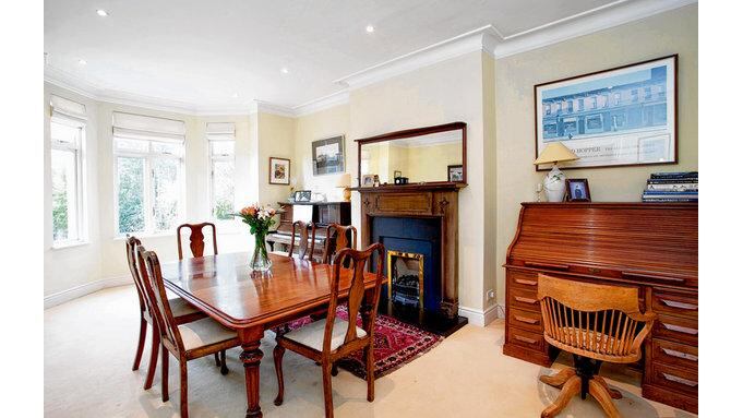 There are three reception rooms downstairs, a big bay-windowed dining room to the front with recessed lighting and bright neutral paint work and the original wooden fireplace. The owner replaced the old broken tiles on the inset of the fireplace and the hearth with black slate.