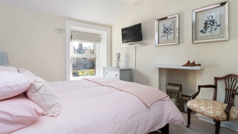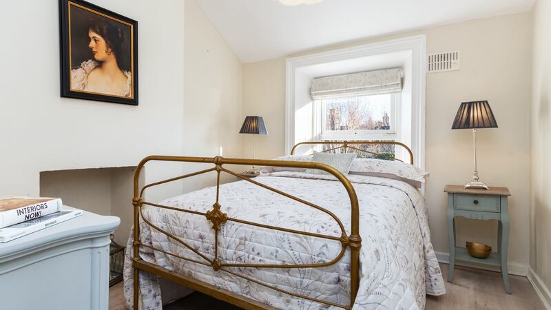 The staircase splits, leading down to the first of the property’s three bedrooms, where a lovely brass bed has pride of place. The ceiling heights at this level are more standard.