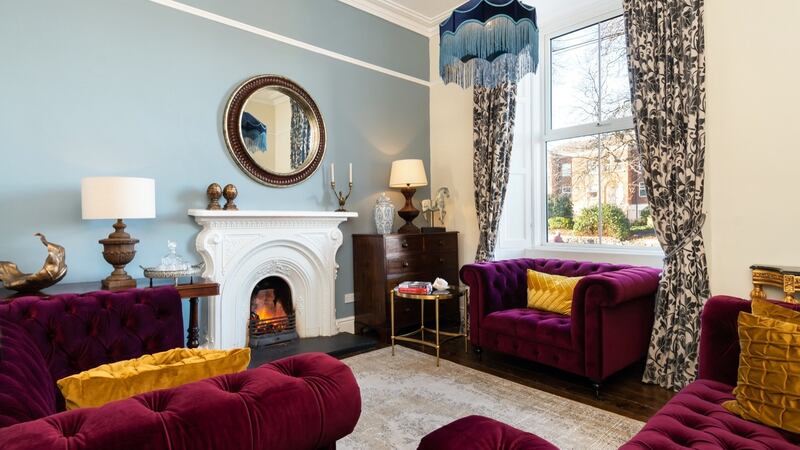 The formal living room is to the right and is painted in a soft vanilla, with a gorgeous robin’s egg blue on its fireplace wall. The surround, ceiling and picture rail are all picked out in an antique white with a trio of mulberry-coloured Chesterfield style sofas bringing in rich jewel tones.