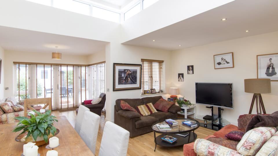 The open-plan space has two sitting areas and while it has lots of glazing, the windows are now shielded by Venetian shutters which somewhat defeats the purpose of this.
