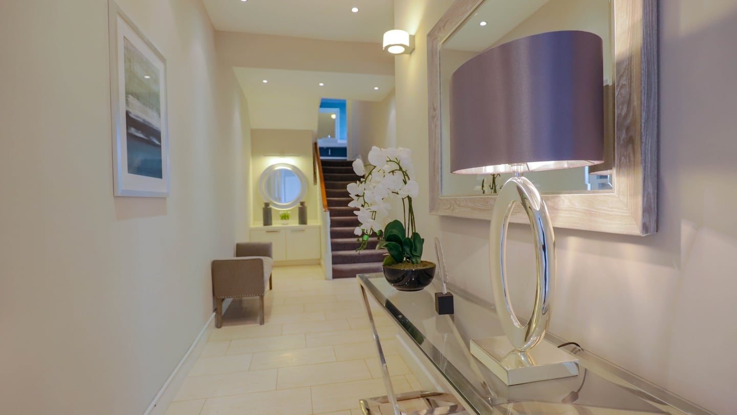 There are three bedrooms at the top of the house – the main bedroom is all luxury: a suite running from front to rear with a dressing area and its own bathroom. The fourth bedroom with its vast picture window looking out over the rear garden is in the hall floor return in the new extension and it has a large study area outside with an en suite making it an ideal space for a teenager. The fifth bedroom – with en suite – is down at garden level to the front.