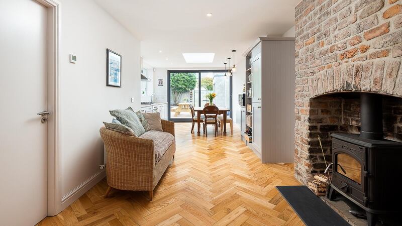 The open kitchen/living area has a range of interesting, palest grey fittings by Aloco of East Wall and a parquet floor. Architect Brenda Carroll went for a long, deep skylight and used every inch of space. The exposed brick chimney breast has a multi-burning stove, "installed just in time for the Beast from the East!"