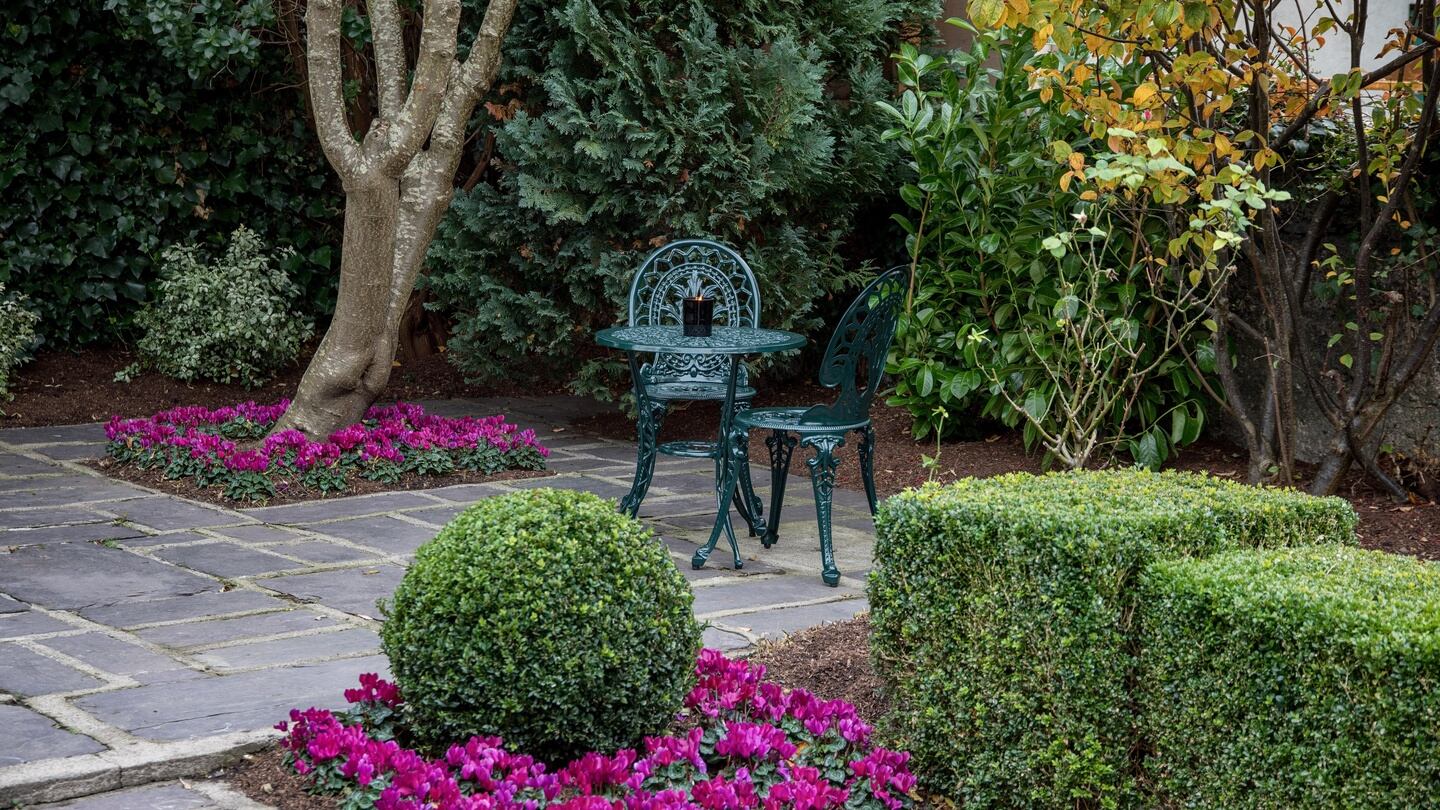 The lollipop bay trees, carpets of crimson cyclamen, all bordered by neat box hedging, were planned by interior designer Emma O'Connor with consultation from award-winning garden designer Paul Doyle.