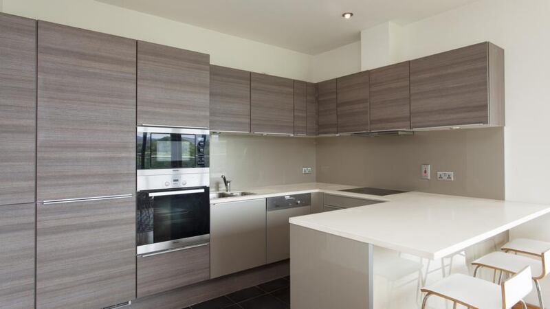 Most of the apartments were sold in 2010 and 2011. Number 12 is a top-floor property, a two-bedroom unit, with a top drawer finish throughout. The main room in the well considered layout is an open plan L-shaped space with a designer kitchen by Poggenpohl and roomy dining and sitting areas offering floor to ceiling glazing on two walls framing views across an empty field to the boundary of Cabinteely Park, one of south Co Dublin’s finest green spaces. Glass sliding doors open out to a sizeable south-facing balcony that feels sheltered.