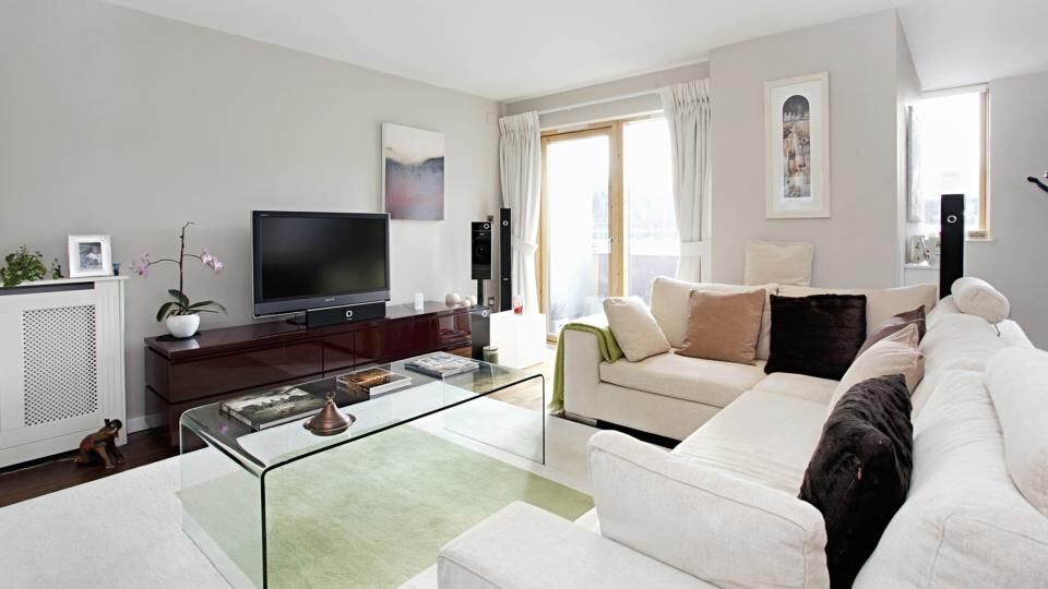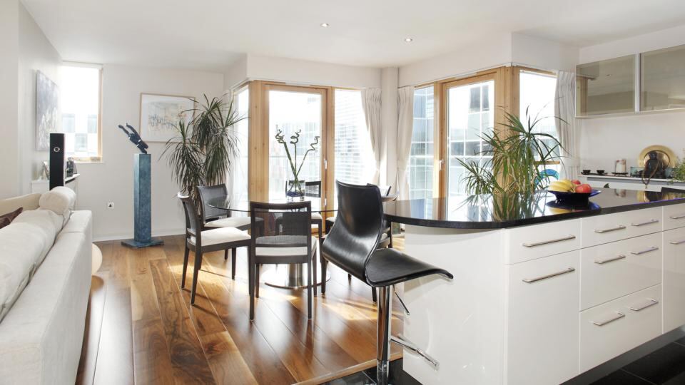 The apartment is swish, with solid walnut flooring throughout and an open-plan kitchen-living-dining area. The streamlined kitchen has high-gloss units with marble worktops and stainless steel integrated appliances, including a Neff coffee maker.