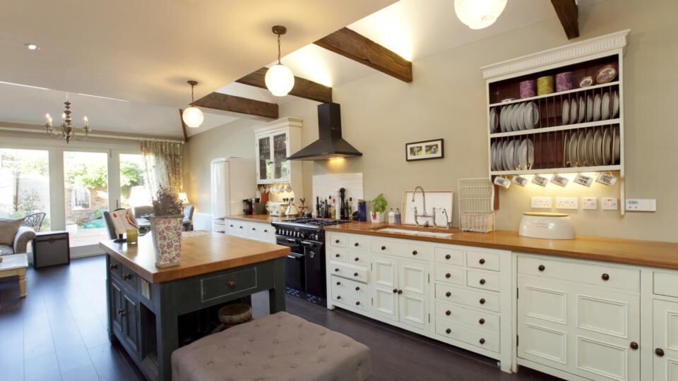 There’s an island unit in the middle and the solid wood cupboards along one wall are country-style Chalon, a sign of the high spec that went into the house. By incorporating a side passage into the new extension they were able to install a series of roof lights, bringing more natural light into this large space.
