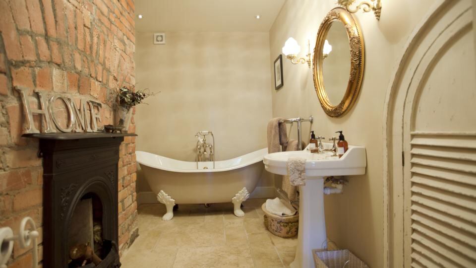The reconfiguring of the layout at the rear let them change what had been the kitchen into the first of the house’s two bathrooms. This attractively fitted-out room has a new stone-tiled floor and is large enough for a free-standing bath and a cast iron fireplace in an exposed brick chimney breast.