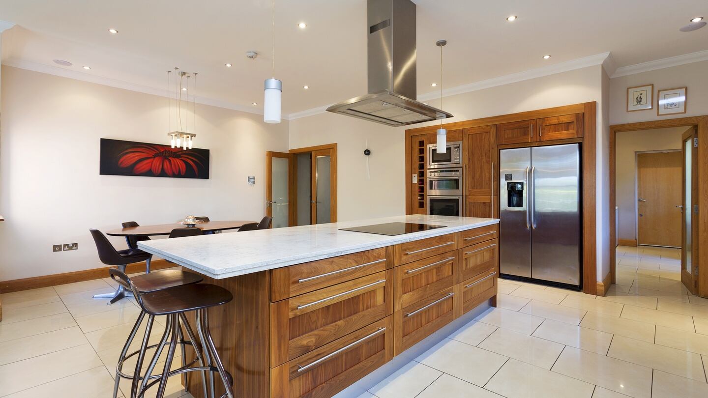 It is clear that they knew what they wanted: a traditional-style house from the outside that would fit into the neighbourhood, but with good energy rating – Malindi Lodge has a B3 rating – and quality modern finishes throughout. Elements specially commissioned for the build include the striking curved oak floating staircase and the solid walnut kitchen.